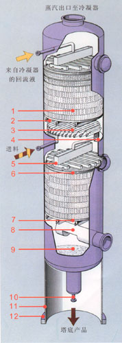 1、规整填料2、支撑栅板3、液体收集器4、集液环5、多级槽式液体分布器6、填料压圈7、支撑栅板8、蒸汽入口管9、塔底10、至再沸器循环管11、裙座12、底座环此结构适合于直径大于等于800mm的填料塔。