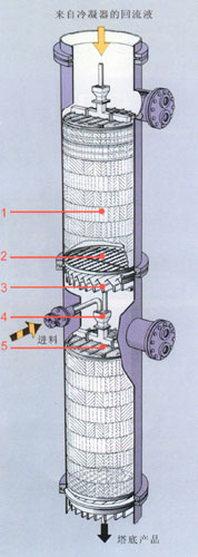 1、规整填料2、支撑栅板3、液体收集器4、降液管5、管式液体分布器此结构适合于直径小于800mm的填料塔。